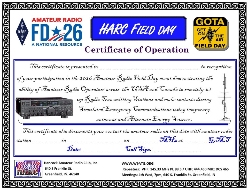 The Hancock Amateur Radio Club will be on the air during ARRL Field Day 2026 operating two HF transceivers and identifying as W9ATG, 2 Alpha, Indiana.
