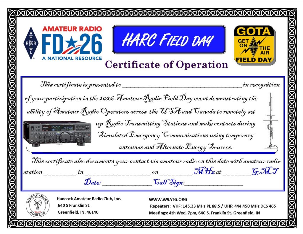 The Hancock Amateur Radio Club will be on the air during ARRL Field Day 2026 operating two HF transceivers and identifying as