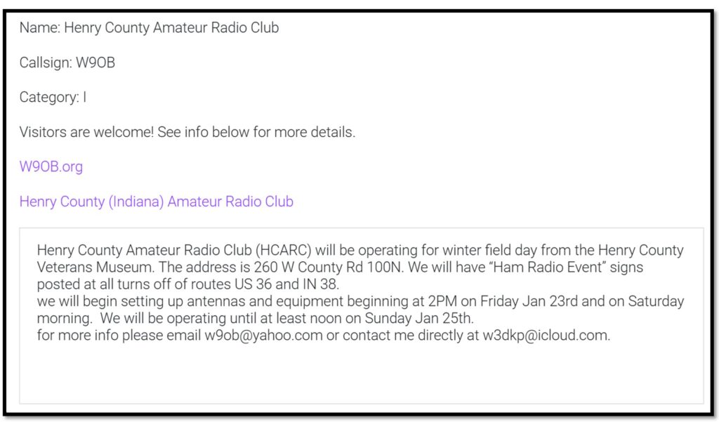 As of the end of December, HARC has not announced any plans to operate a station during the 2026 event. For anyone wishing to participate, the closest Winter Field Day site to Greenfield is in Henry County